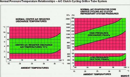 around the car. results in fahrenheit: -dashboard vent discharge 35 degrees -seat surfaces 48 degrees -exhaust manifolds 478 degrees -high side pressure hose assembly near service port 122 degrees -tailpipe output under rear bumper 108 degrees |