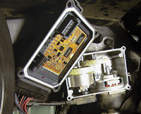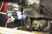 The workhorse that pulls the throttle open with an old-fashioned cable is a rugged stepper motor mounted in cast aluminum with an electromagnetic clutch. The clutch deactivates when the brake is pressed and the normally closed switch opens, dumping the 12-volt power to the electromagnetic field. This represents the old vacuum dump, and operates through a brake pressure switch on some vehicles and a pedal travel switch on others.