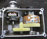 | 1. Good Servo: Here’s a view of the disassembled servo-amp. For the electronics, the old-fashioned circuit board has been replaced with soft-potted space age amplifier. The old vacuum servo was supplanted by this cast aluminum assembly with a big stepper motor that pulls the cable through a network of plastic gears and an electromagnetic clutch. |