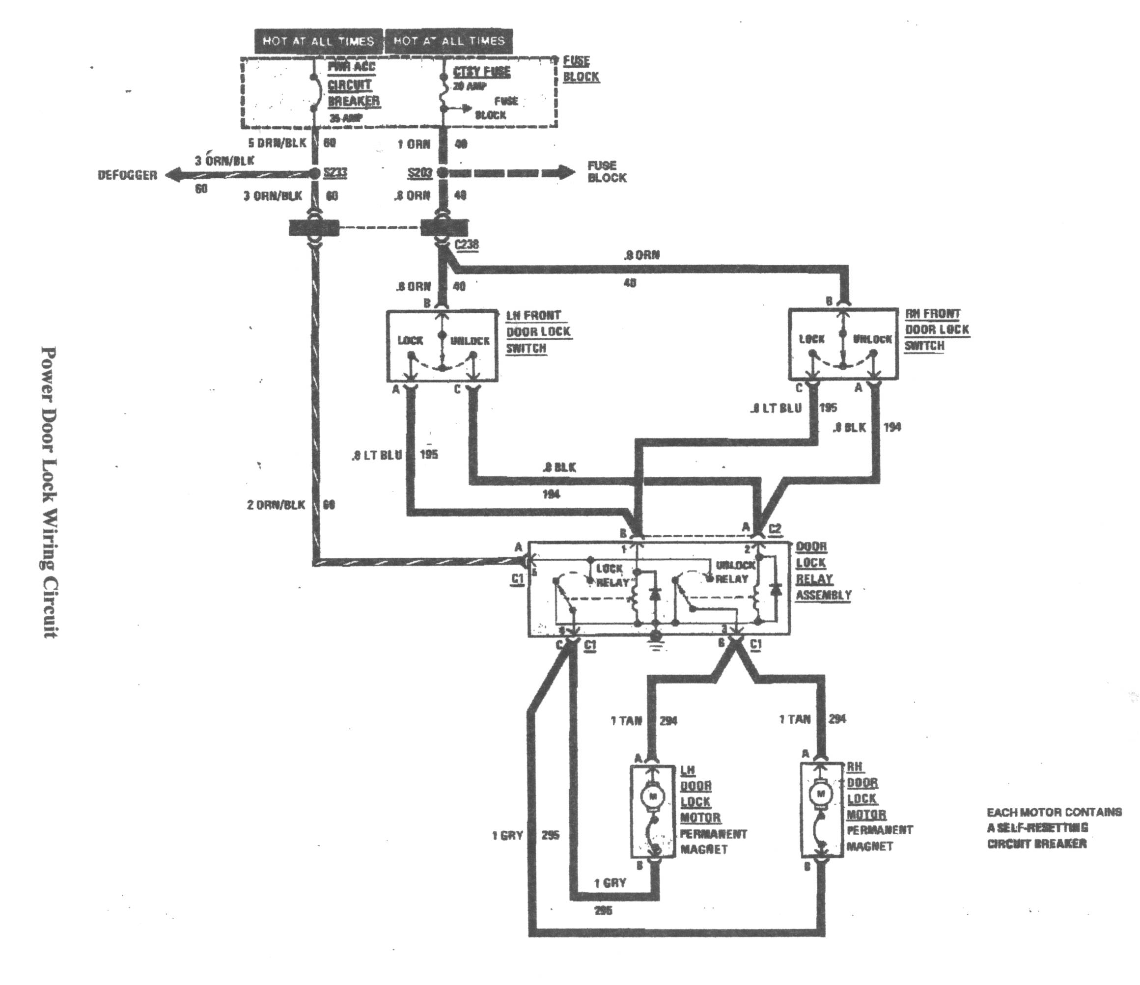As you can see below, the factory power lock setup gets power from two seperate circuits. Power for the actuators is provided by the "pwr acc" circuit breaker and power for the switches is provided by the "ctsy" fuse. Orange with black stripe wire powers rear window defroster, power seats & power lock actuators. Orange wire from the courtesy circuit powers a couple other items besides the lock switches including the cigar lighter, dome lights, and radio.