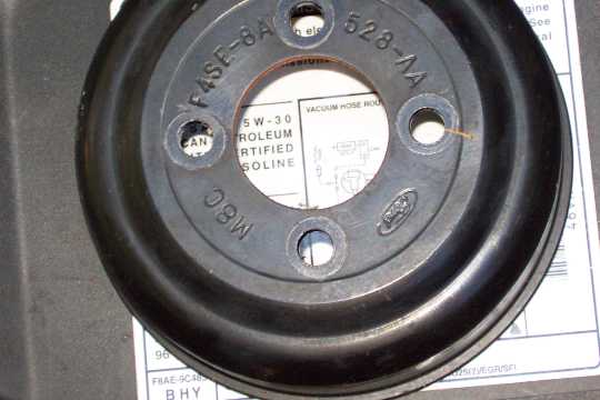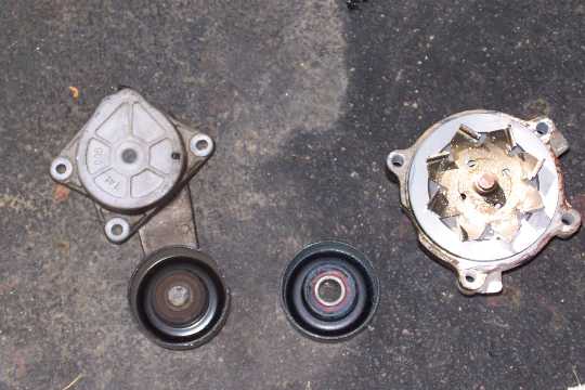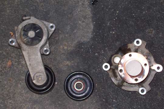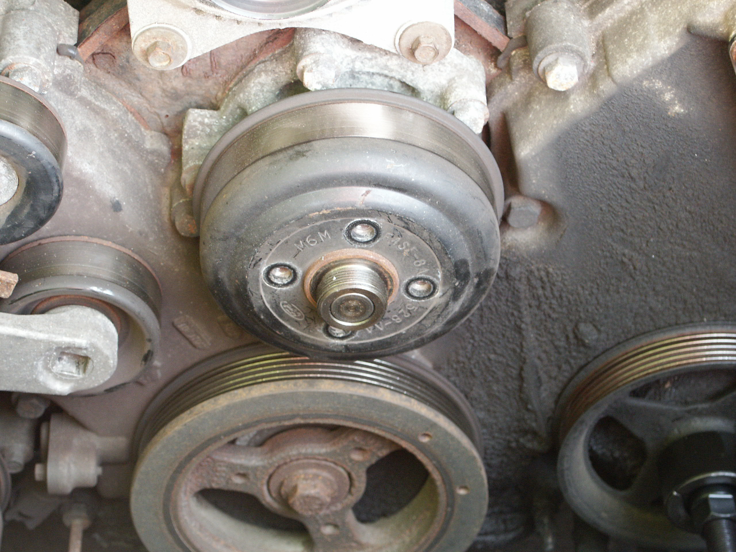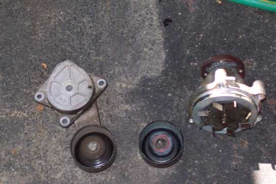 In the picture below, the component on the left is the belt tensioner. The component in the middle is the idler pulley (#8 in diagram above). The component on the far right is the waterpump (#2 in the diagram above). A note of intrest, both the idler pulley and the pulley attached to the belt tensioner have the same ford part number stamped into them.