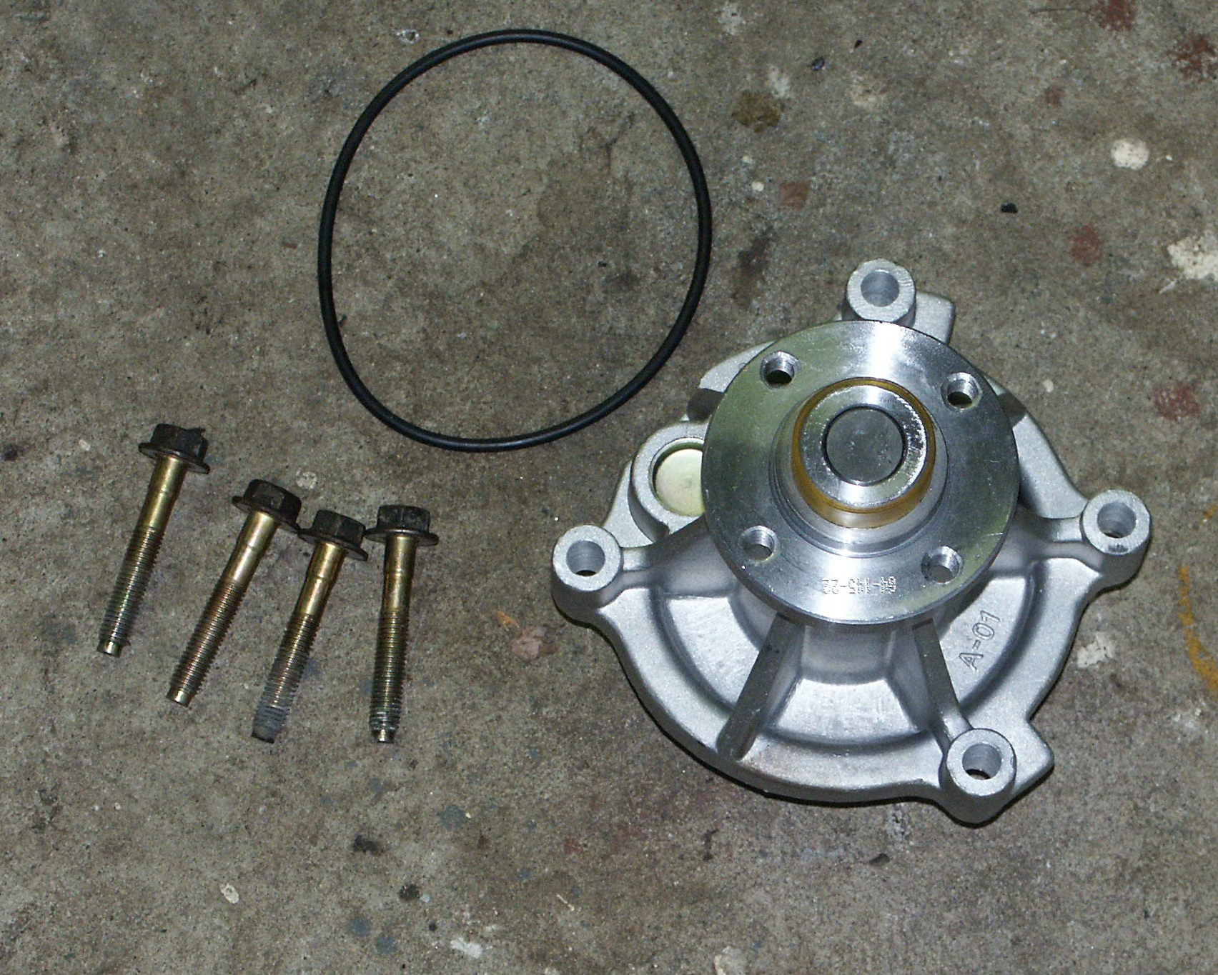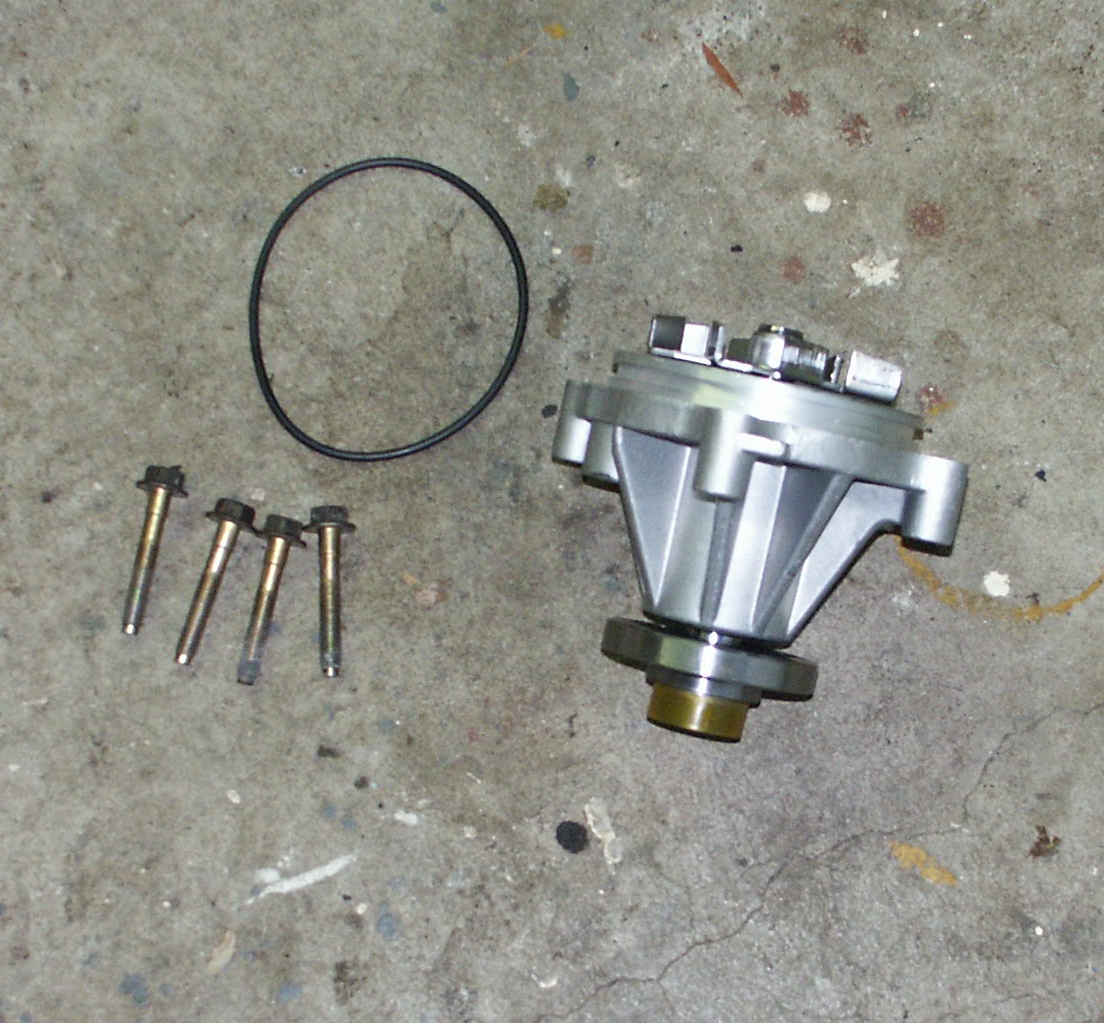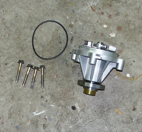 Place large O-Ring around the new water pump and slide the new pump into place. Insert and tighten 4 bolts that retain pump to engine block.