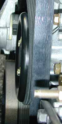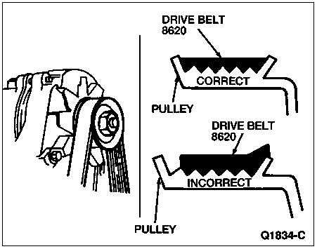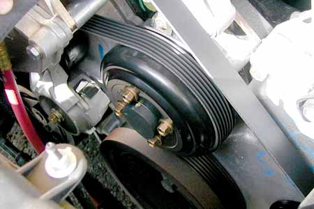 Relieve tension on the automatic belt tensioner and then place the serpentine belt back over all the accessories. Carefully inspect accessory pulleys to make sure that belt is aligned properly. (Pay very close attention to the alignment of the belt on the a/c compressor).